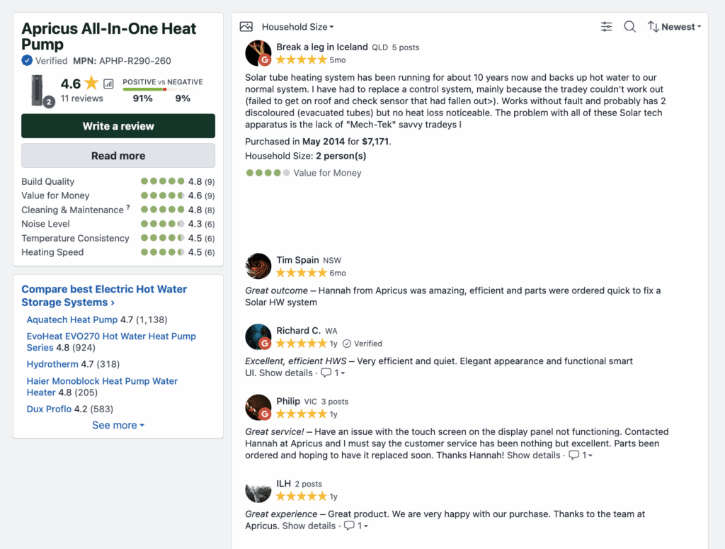 Apricus heat pumps currently score 4.6 on Product Review. However, this is only from 11 reviews, so it’s not a large sample size.