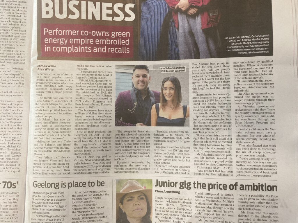 I stumbled across an article on Ecogenica in the paper in early 2025. The article details Carlo Salantri’s (from Sooshi Mango) involvement in Eco Alliance, the company behind Ecogenica. Interestingly, the article claims that Mr Salantri is distancing himself from the negativity around Ecogenica’s products.