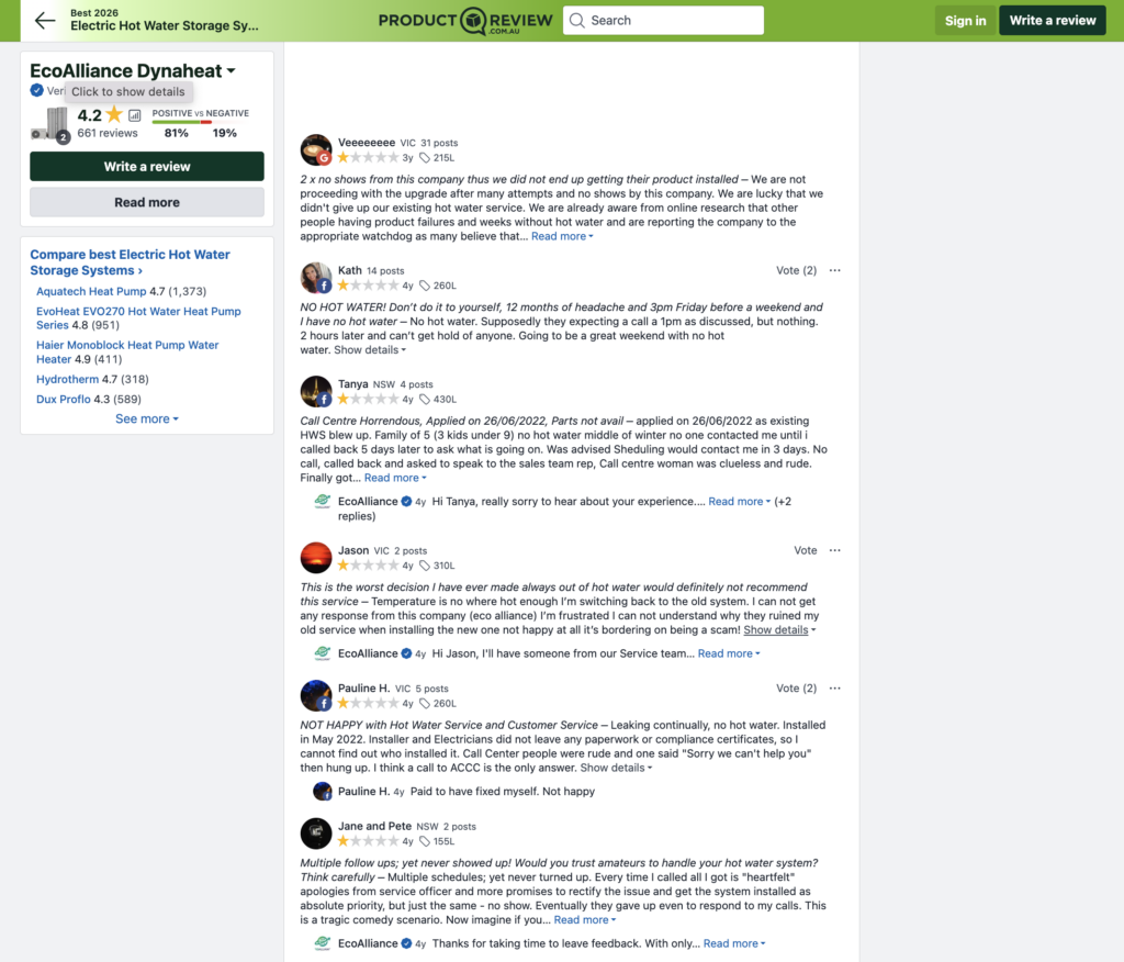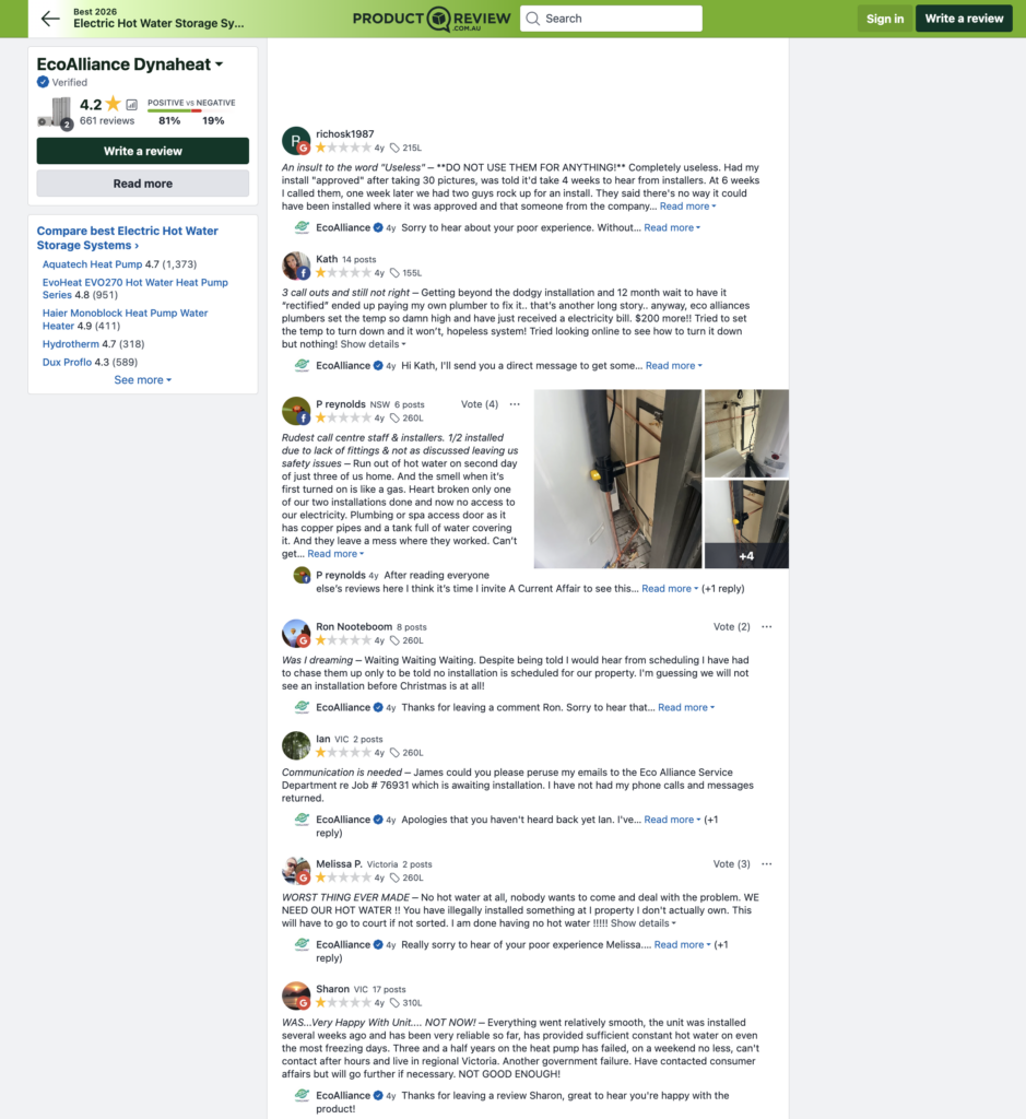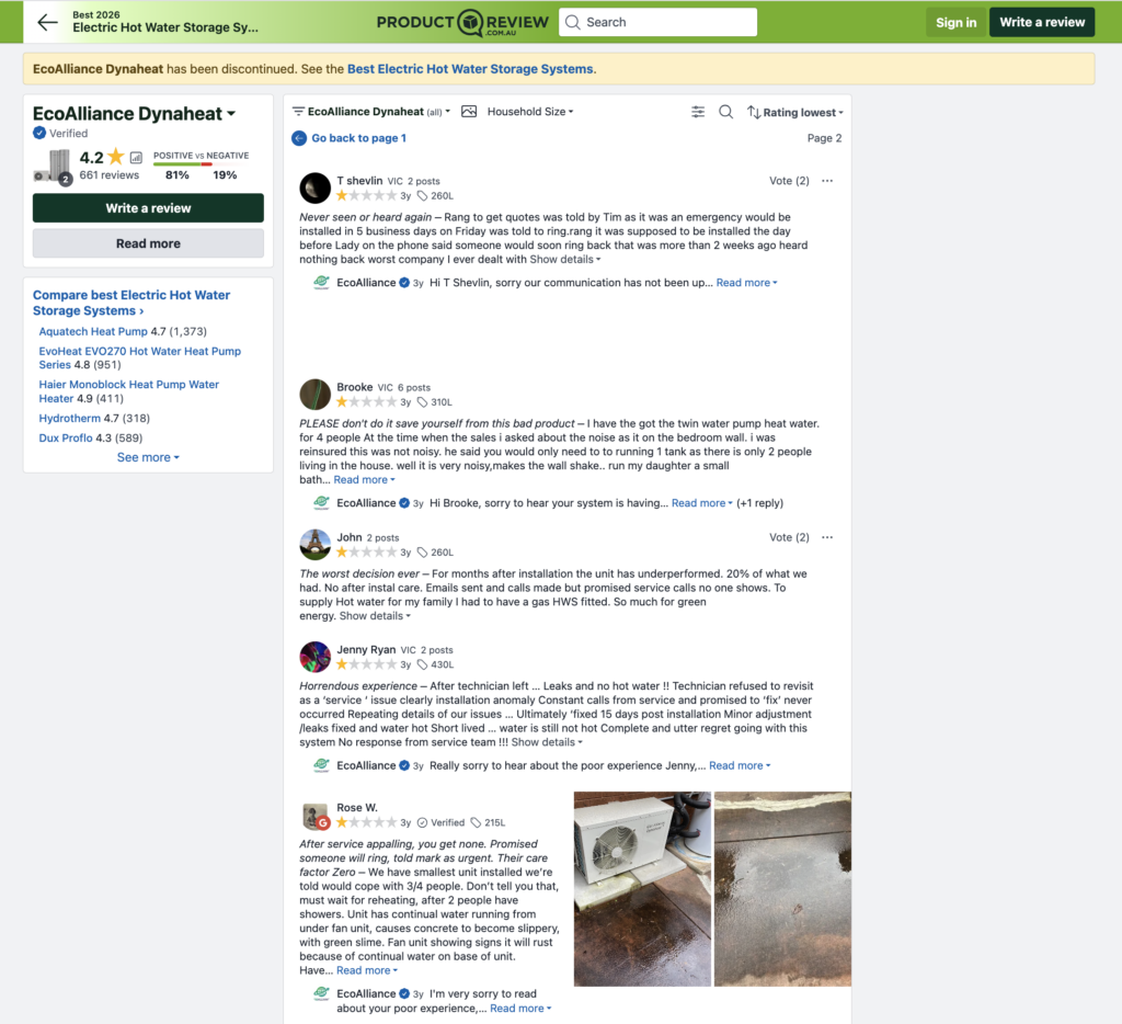 There is another listing on Product Review for Eco Alliance, the company behind Ecogenica heat pumps. The reviews here are also concerning. Eco Alliance scores 1.9 from 39 reviews. You can see the vast majority are negative. Of even greater concern is the consistent comments about poor customer service, suggesting if things go wrong, it might be difficult to expect any help.