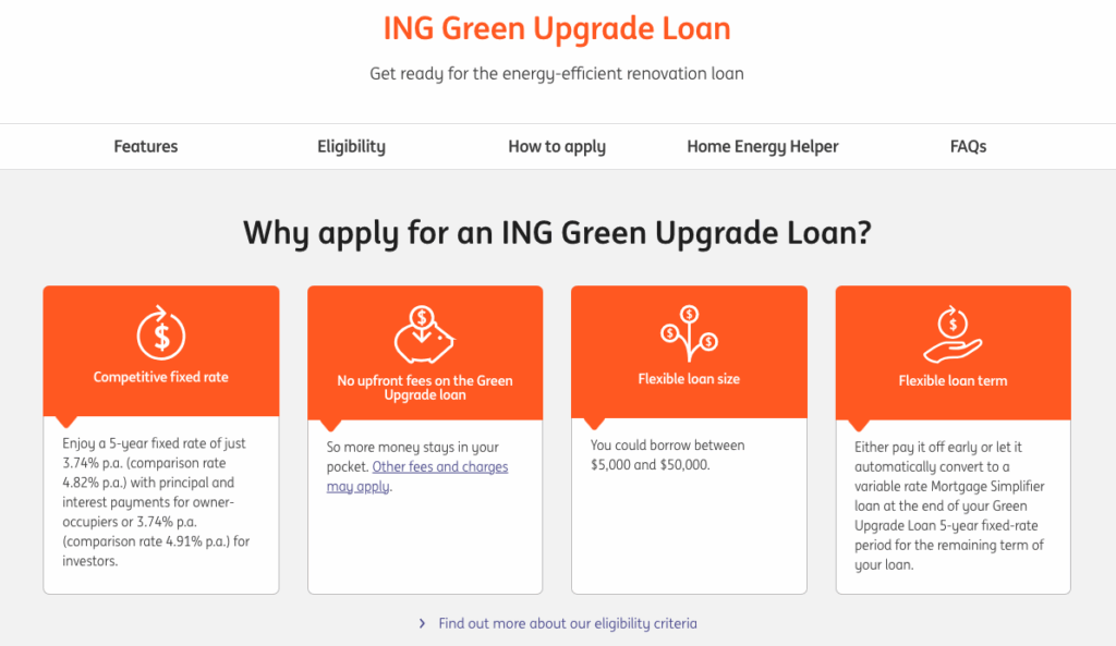 ING currently have Green Upgrade Loans available from as low as 3.74% (4.82% comparison rate for owner-occupiers). Conditions apply.