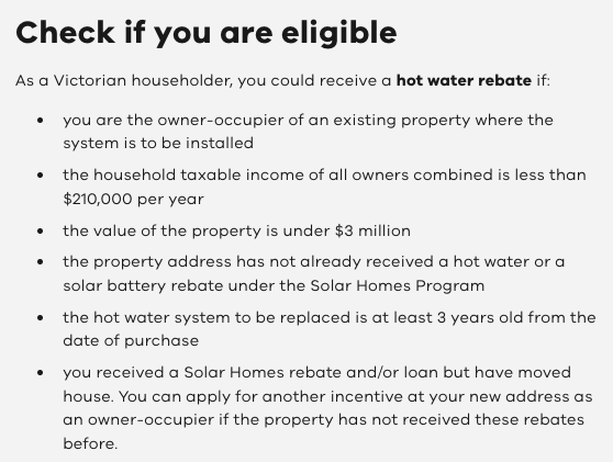 As well as VEECs, the Victorian Government offers a $1,000 rebate (or $1,400 on some models) on eligible heat pump hot water installations. This is the rebate that is means tested.